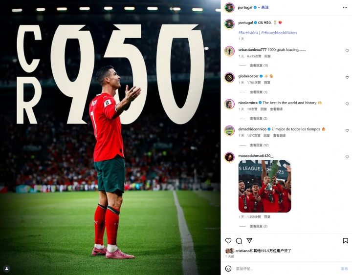 2025-10-28 00:02:37葡萄牙国家队官方晒C罗950球海报:CR950⏳历史需要创造者