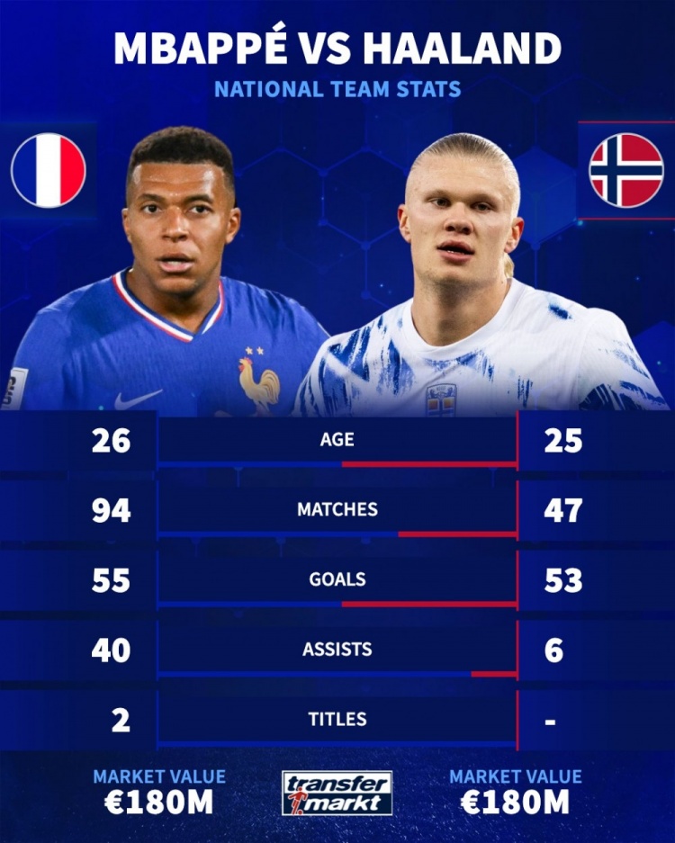 2025-11-15 16:01:22德转对比国家队数据:姆巴佩94场55球40助,哈兰德47场53球6助