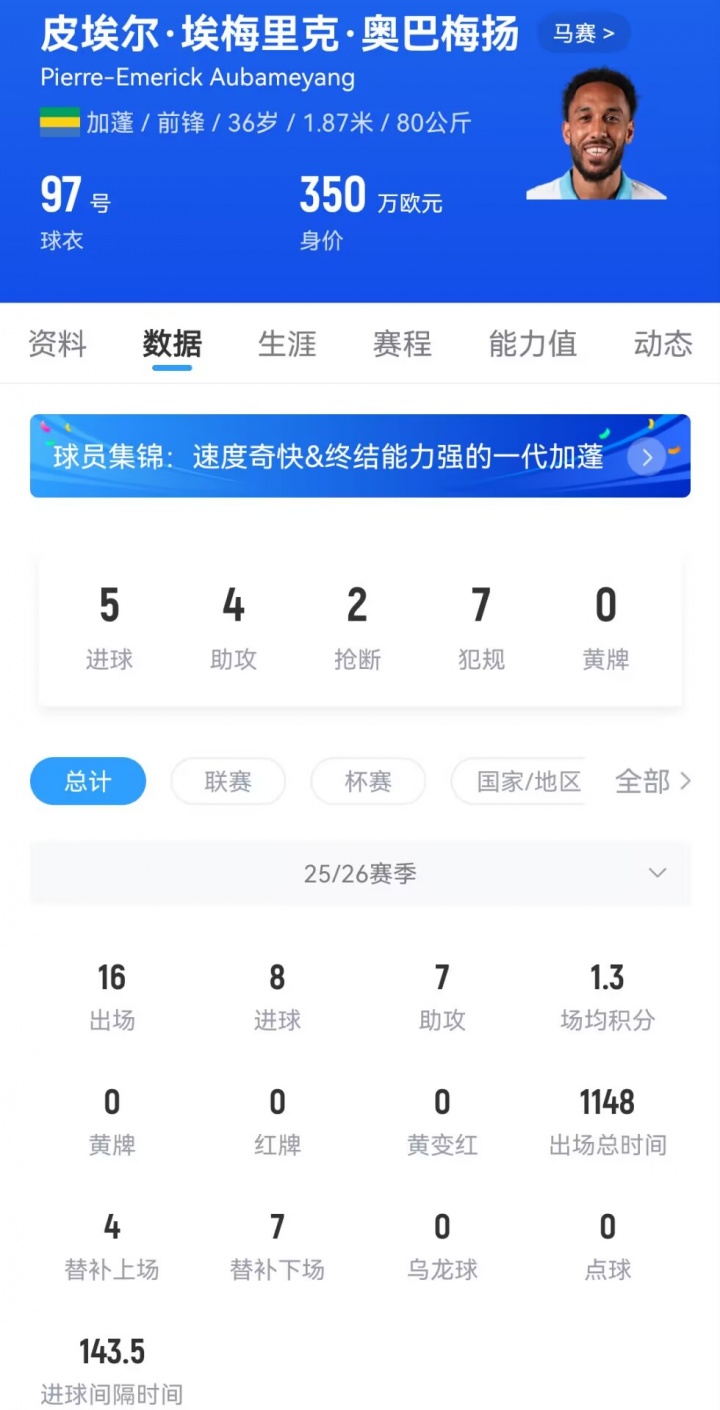 夏窗奥巴梅杨以自由身回归此前效力过的马赛,新赛季为俱乐部在法甲+欧冠共出场16次,打进8球助攻7次,直接参与15粒进球。独造两球带队逆转强敌后,奥巴梅杨的神锋故事仍在继续。
