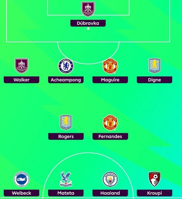 后卫:凯尔-沃克(伯恩利)、阿昌庞(切尔西)、马奎尔(曼联)、迪涅(维拉)